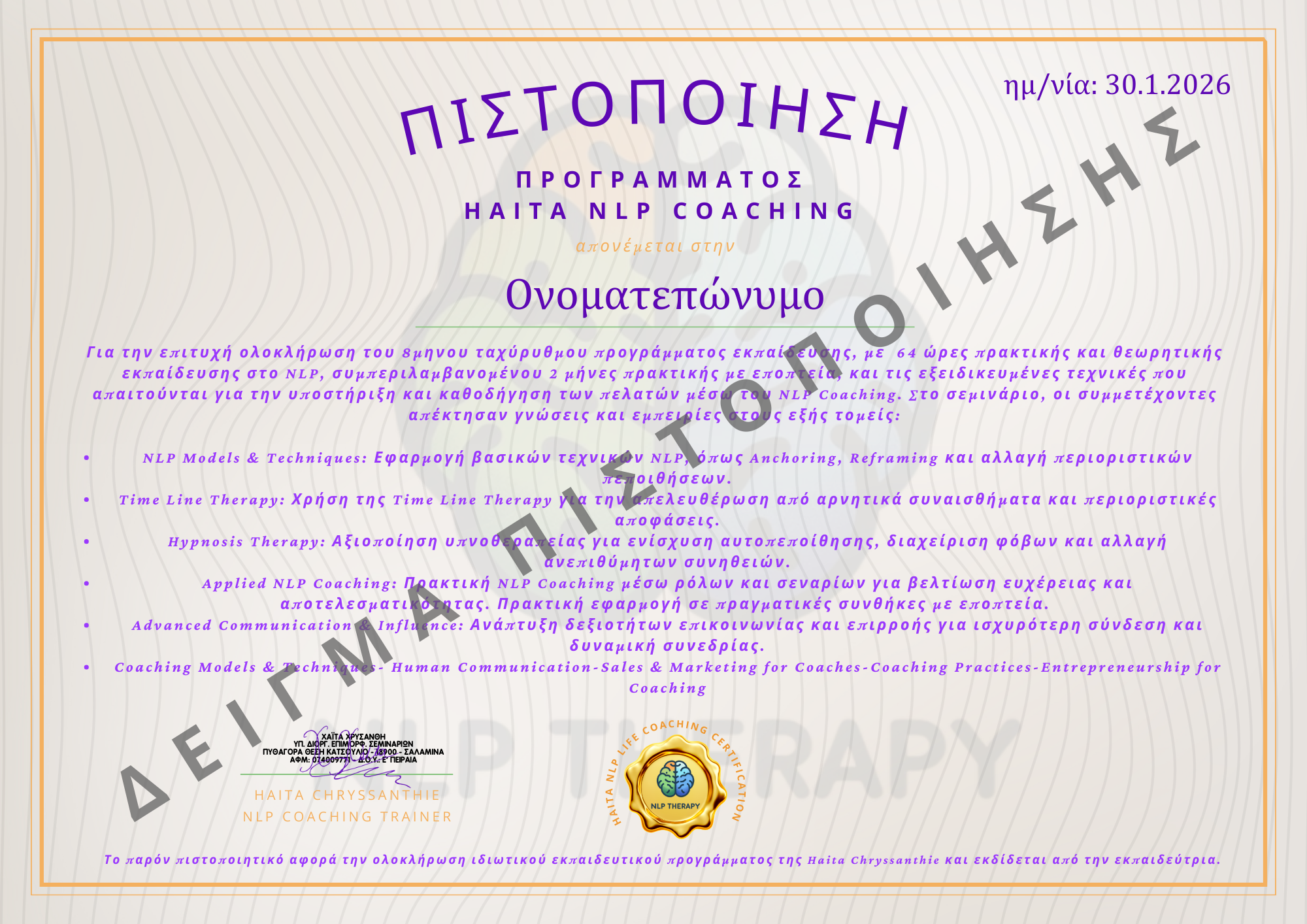 1. Λήψη Πιστοποίησης Παρακολούθησης Σεμιναρίων NLP Coaching, που σας επιτρέπει να ξεκινήσετε την καριέρα σας ως NLP Coaches, από την αναγνωρισμένη και πιστοποιημένη από τον διεθνή οργανισμό NLPEA, NLP Coach Haita Chryssanthie.